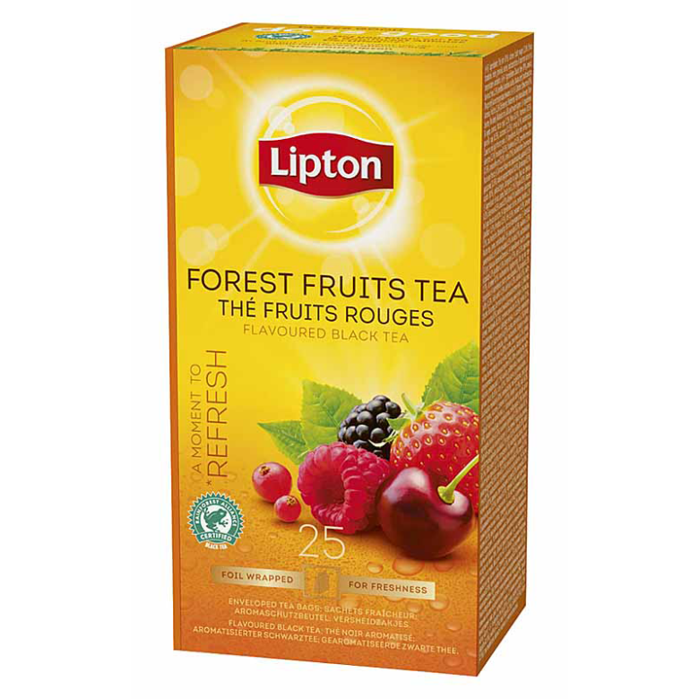 Ett svart te, smaksatt med frukter och bär. Det är bara att välja sin favorit. 25 påsar/förp. 6 förp./kartong.