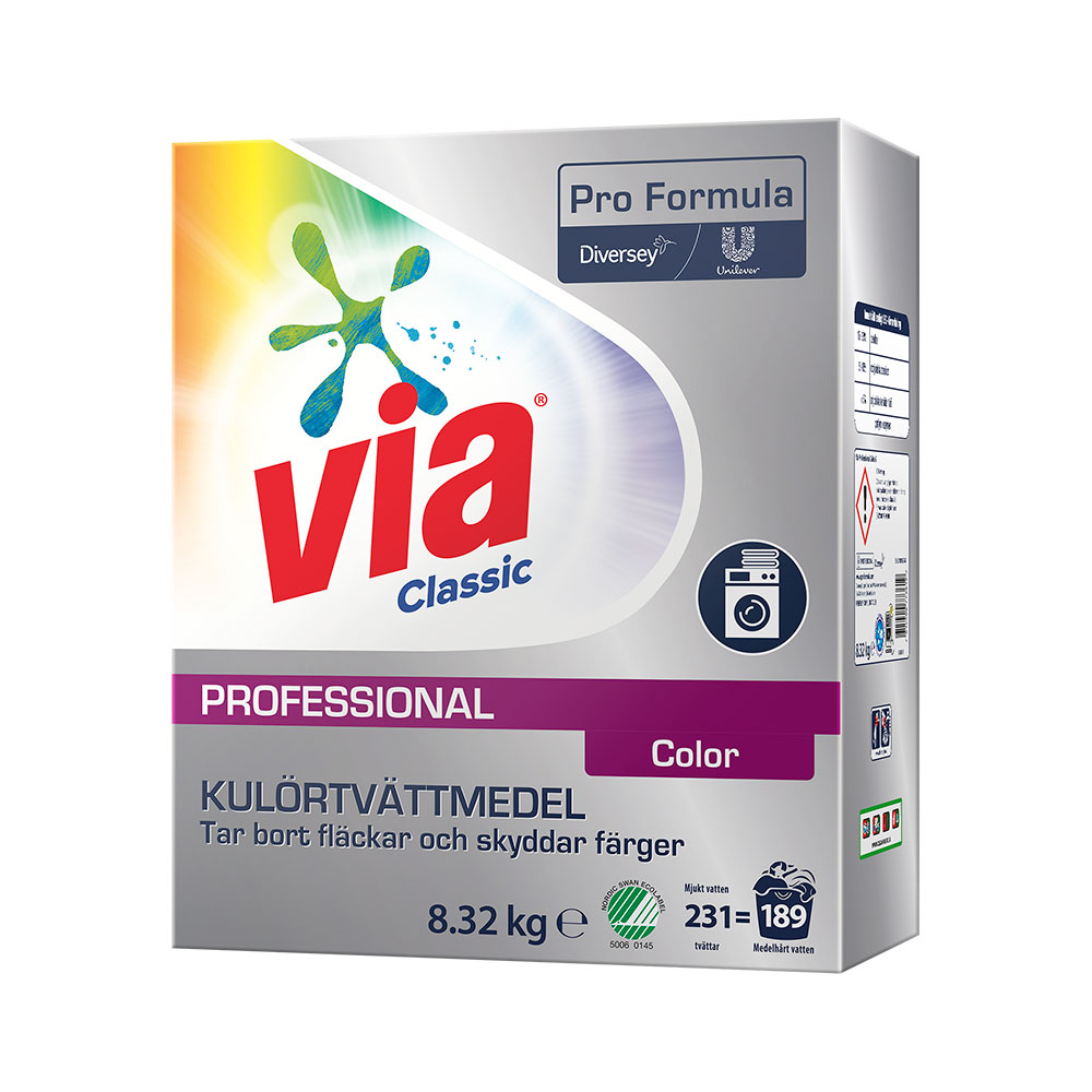 För vit- och kulörtvätt i pulverform. Utan blekmedel. Förpackningen är i hård kartong med bärhandtag.