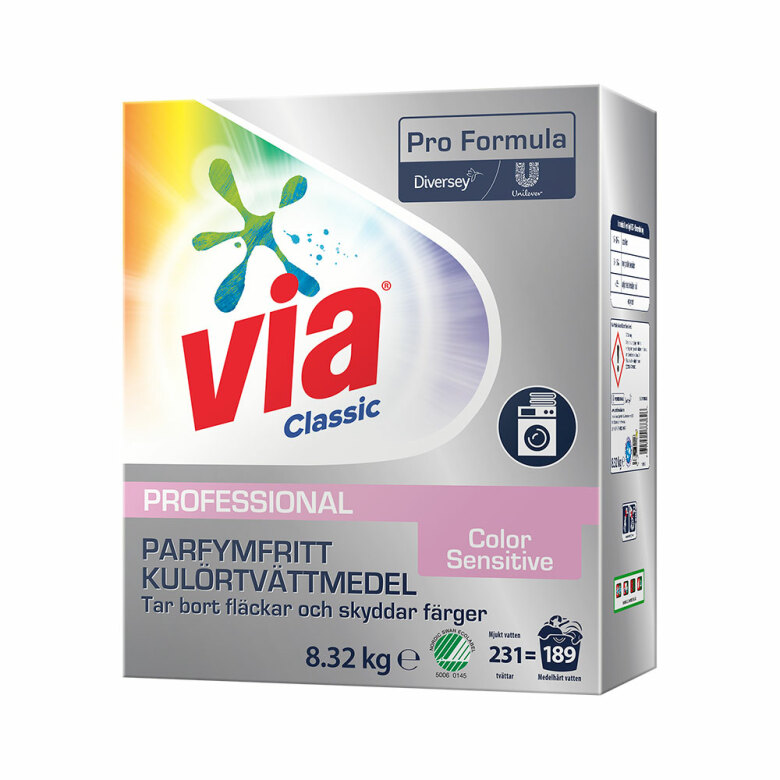 För vit- och kulörtvätt i pulverform. Utan blekmedel. Förpackningen är i hård kartong med bärhandtag.