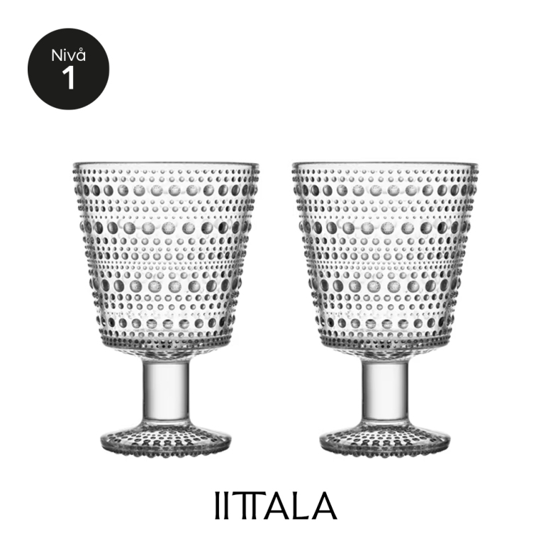 Designlegenden Oiva Toikka undersökte olika sätt att dölja skarvar i glas när han uppfann den banbrytande upphöjda droppdesignen som gör Kastehelmi så speciell. Kastehelmi har ringar med glasbubblor som efterliknar strängar med glittrande daggdroppar i morgonsolen. Varje del i serien är som vackrast när ljus får spela i glaset och framhäva dess gnistrande skönhet. Iittalas populära Kastehelmi-serie består av en mängd olika mångsidiga och taktila delar som är både funktionella och dekorativa. Kastehelmi-dricksglaset är ett klassiskt exempel på finska glas. Skira men tåliga dricksglas som passar alla inredningsmiljöer. Det klara glaset skapar en enkel elegans. Setet med två glas är en perfekt present.