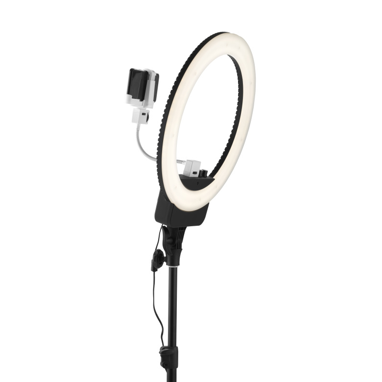 Ring Light With Stand är en fotoring på stativ för selfies, porträtt eller live-foton. Man kopplar lätt in telefonen i ringen och tar selfiebilder med riktigt bra ljus. Fotoringen har justerbar färgtemperatur och ljusstyrka samt en dimmer.