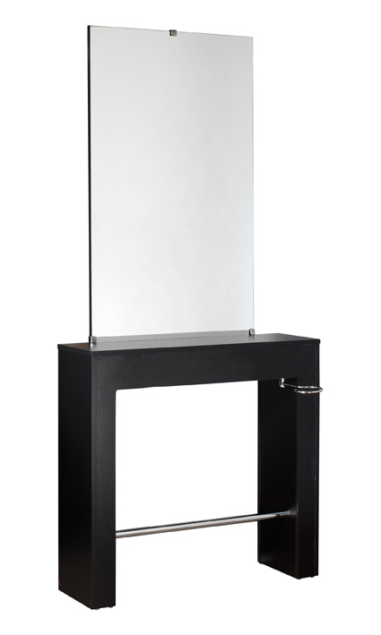 Styling station of a dark coloured wood veneer with mirror, fold-out hairdryer holder, integrated stabile footrest, available as a single or double version. Twin styling station