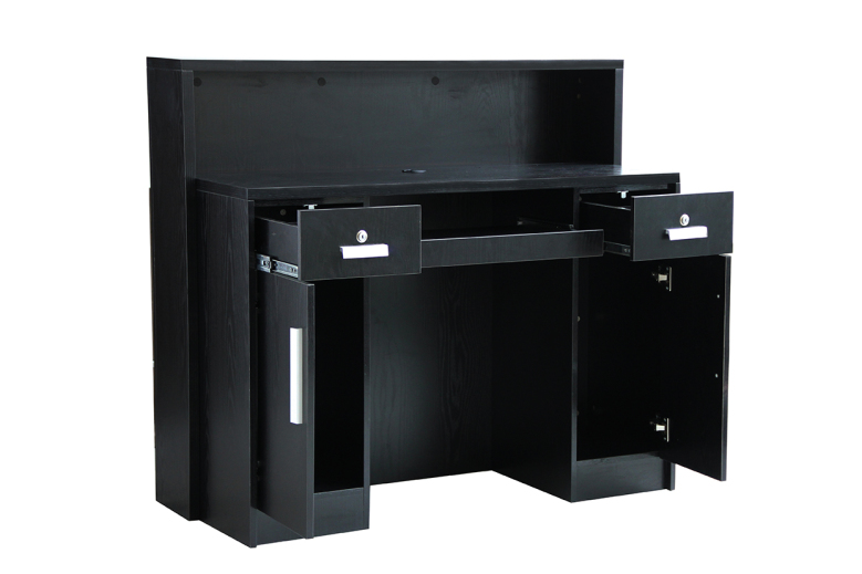 State-of-the-art elegant desk in black, laminated wood, equipped with 2 lockable drawers, removable shelf space and 2 cupboards for additional storage space, very easy maintenance.