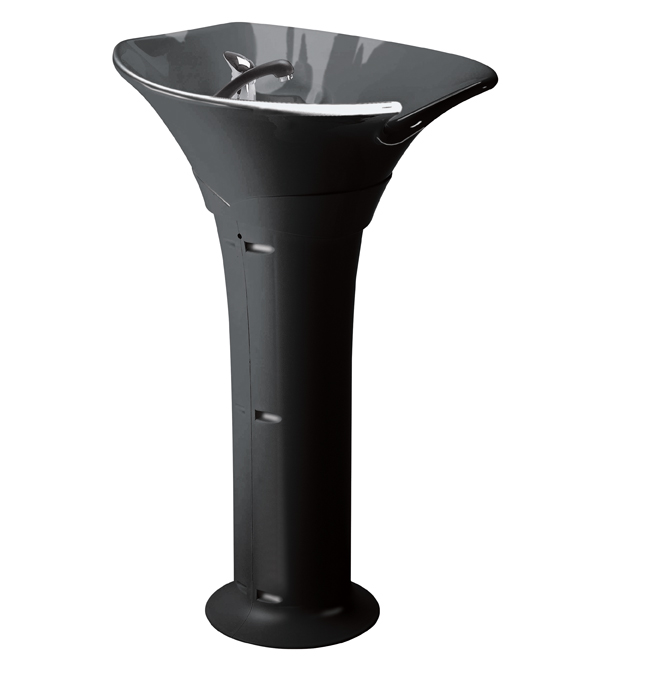 Pillar of thermoplastic with tilting basin and lever mixer. Ceramic basin