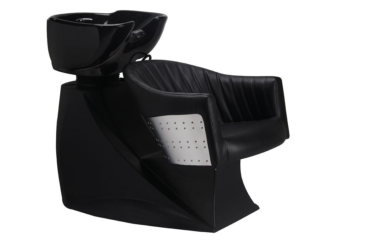 Comfortable washing area in a modern retro design. The body is made of firm, black fibre glass, which is easy to clean. The ceramic basin can be tilted. The chair was manufactured with high-quality imitation leather and provides pleasant sitting comfort due to its excellent cushioning. The back rest is decorated with aluminium and serves as an eye-catcher in the salon. Remaining hair can easily and quickly be cleaned off the chair thanks to the opening in the back.