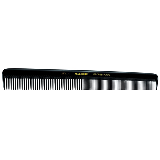 A high-end line of combs from New-York Hamburger, one of the world leading comb manufacturers. They are made from vulcanized natural rubber (ebonite) and go through a staggering 24 steps in production from a solid block of rubber to a finished comb. Matador combs with their cone-shaped, finely polished and rounded pins glide softly through the hair, no tangling or knotting, no damage to hair. Like in the past, the comb pins are formed in an elaborative, largely manual process through sawing with diamond cutters. The material is also very resistant to heat, discoloration and acids.