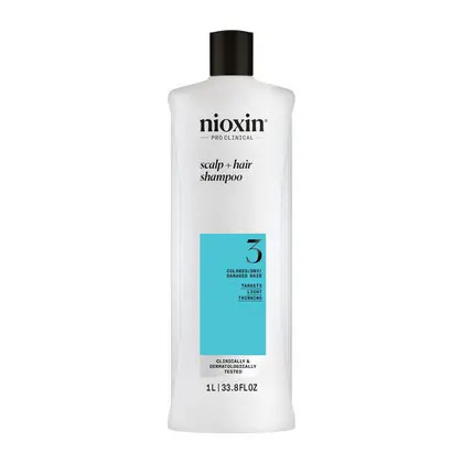 Nioxin System 3 Cleanser Shampoo för färgat hår med lätt uttunning är det första steget i en tredelad Nioxin-rutin, särskilt framtagen för att stärka håret och hårstrukturen. Detta professionella schampo rengör huden och avlägsnar smuts, överflödig olja och andra miljörester från hårbotten och hår. Detta kliniskt och dermatologiskt testade schampo innehåller extrakt av vitt te och återfuktar hårbotten och hår från rot till topp samtidigt som det gör hårstrukturen tjockare och starkare. Avsluta med Nioxin System 3 Conditioner och Nioxin System 3 Treatment för bästa resultat. Finns i 2 storlekar: 300 ml och 1000 ml.