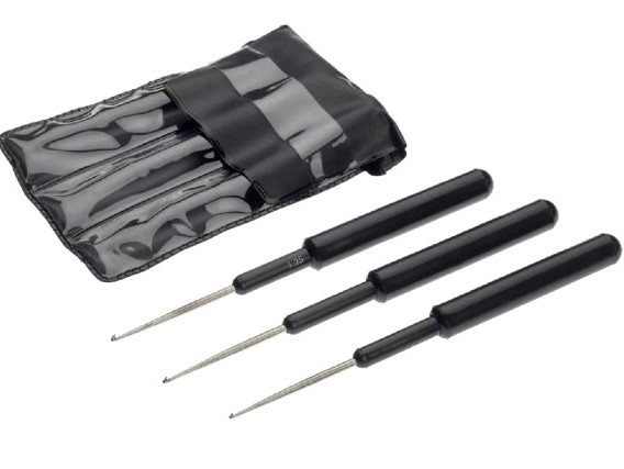 Paket med 3st krokar för genomföring av hårstrån genom hättor.