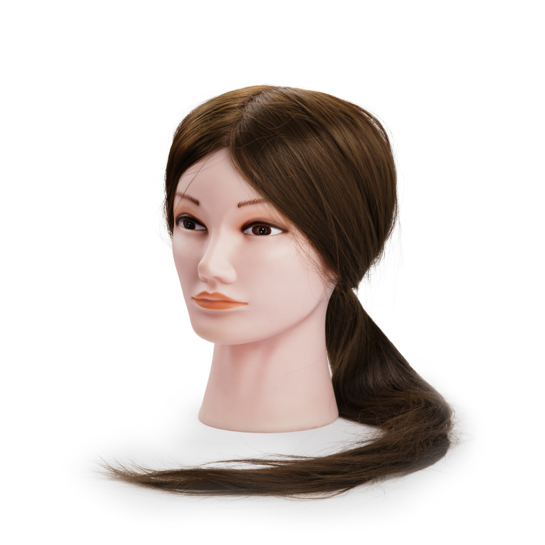 Mannequin implanted with synthetic hair. They are suitable for cutting and styling, but should not be colored/bleached, permed or styled with any hot styling tools.