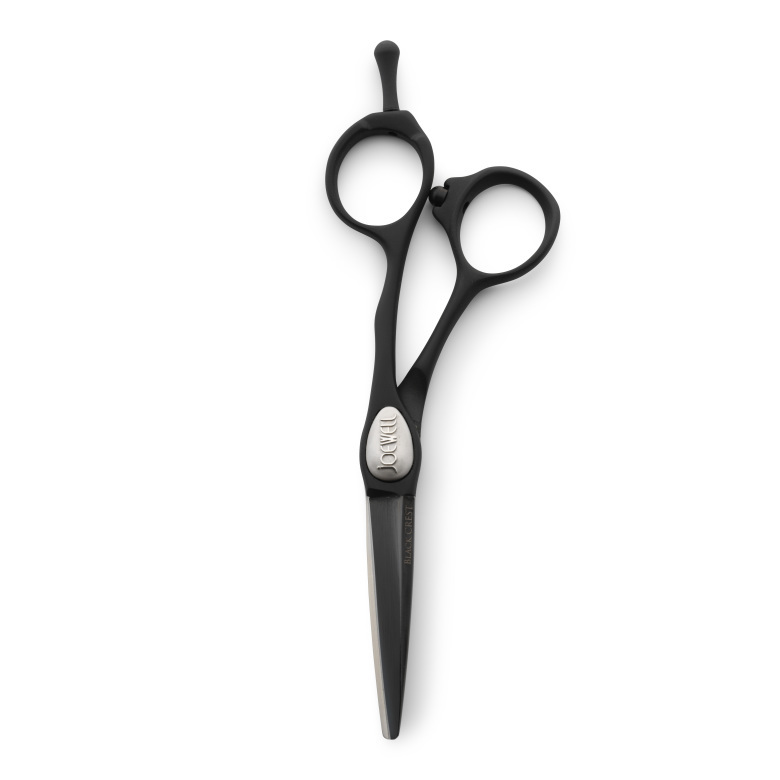 Comfortable scissor with ergonomic handle in black titanium with rubber coating. Ideal for hairdressers that sometimes suffer allergic reactions.